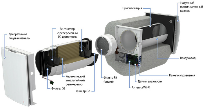 Рекуператор проветриватель состоит из двух решеток, вентилятора, двух фильтров класса G3, телескопического канала и рекуператора. Устройство встраивается в стену комнаты, которая выходит наружу.
